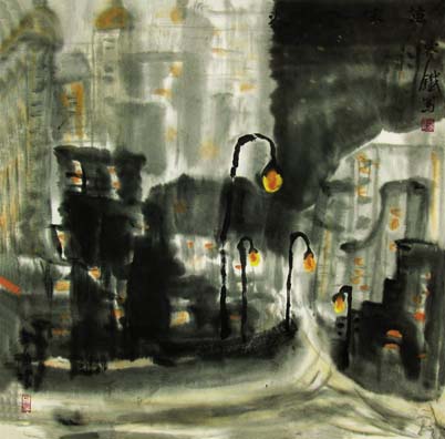 容铁国画作品《万家灯火》